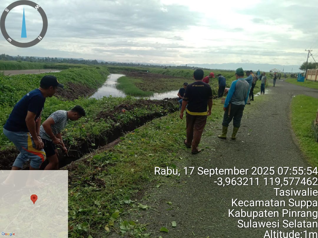 Pinrang_ Untk menjaga kebersihan Lingkungan, Koramil-01/Suppa Kodim 1404/Pinrang menggelar kerja bakti bersama warga dengan sasaran pembersihan pembersihan saluran air di Desa Tassiwalie Kecamatan Suppa Kabupaten Pinrang, Rabu (17/09/2025).