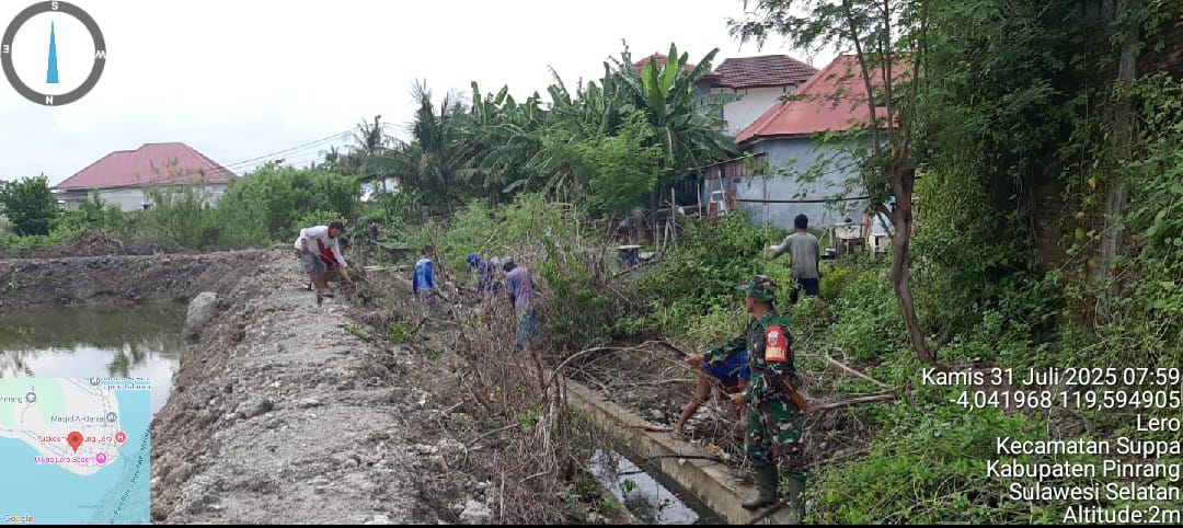 Pinrang_ Untk menjaga kebersihan Lingkungan, Koramil-01/Suppa Kodim 1404/Pinrang menggelar kerja bakti bersama Staf Kelurahan, Bhabinkamtibmas dan warga dengan sasaran pembersihan saluran air di Dusun Butung Desa Lero Kecamatan Suppa Kabupaten Pinrang, Jum’at (01/08/2025).