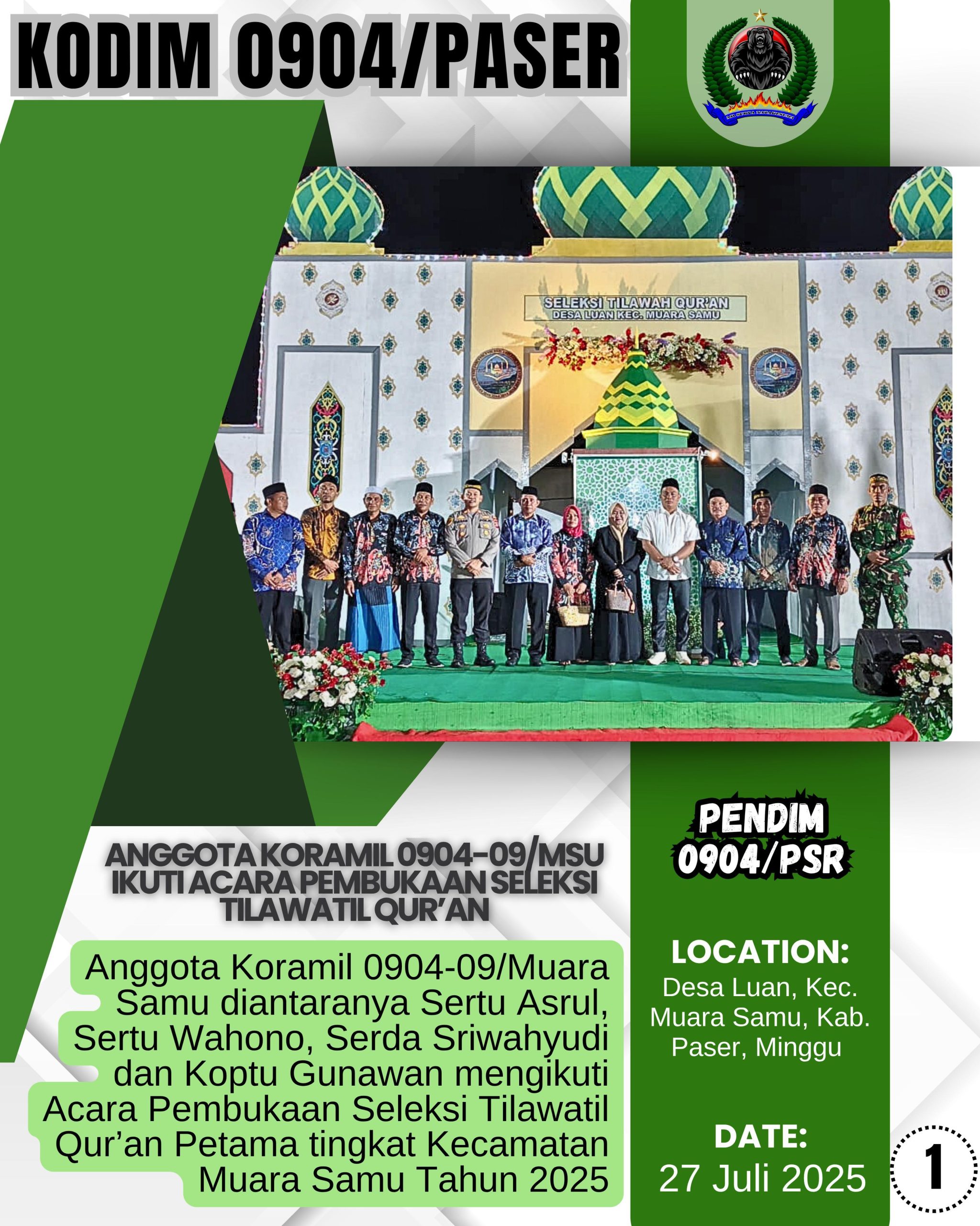 Kodim 0904/Psr, Korem 091/ASN, Kodam VI/Mlw – Anggota Koramil 0904-09/Muara Samu diantaranya Sertu Asrul, Sertu Wahono, Serda Sriwahyudi dan Koptu Gunawan mengikuti Acara Pembukaan Seleksi Tilawatil Qur’an Petama tingkat Kecamatan Muara Samu Tahun 2025 di Desa Luan, Kec. Muara Samu, Kab. Paser, Minggu (27/7/25).