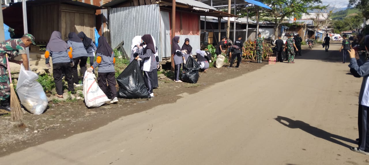 Tampak anggota Koramil bersama masyarakat bersemangat membersihkan sampah dan rumput-rumput liar di selokan, untuk kemudian dibuang ke tempat sampah yang tersedia.