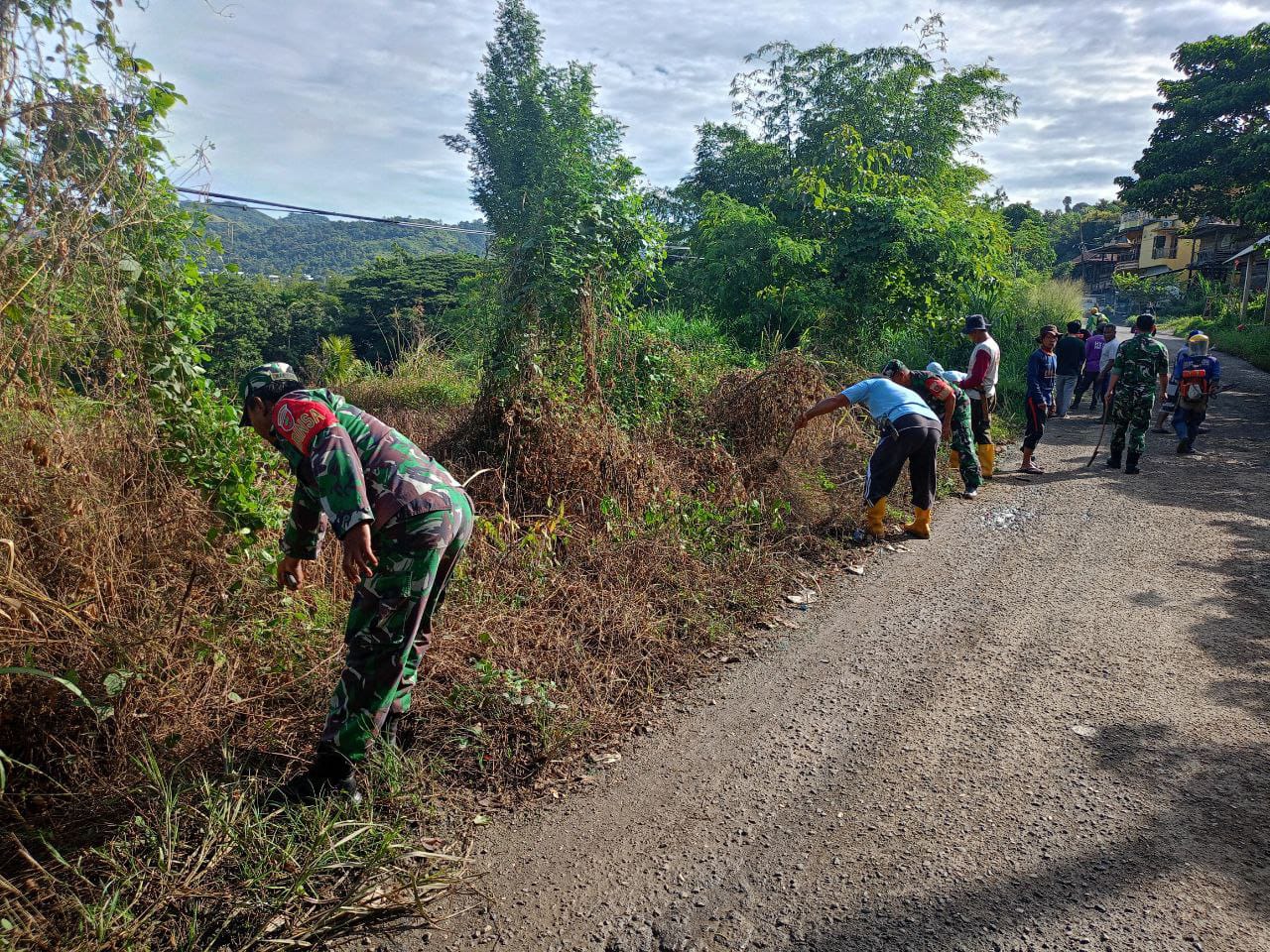Tampak anggota Koramil bersama masyarakat bersemangat membersihkan sampah dan rumput-rumput liar di selokan, untuk kemudian dibuang ke tempat sampah yang tersedia.