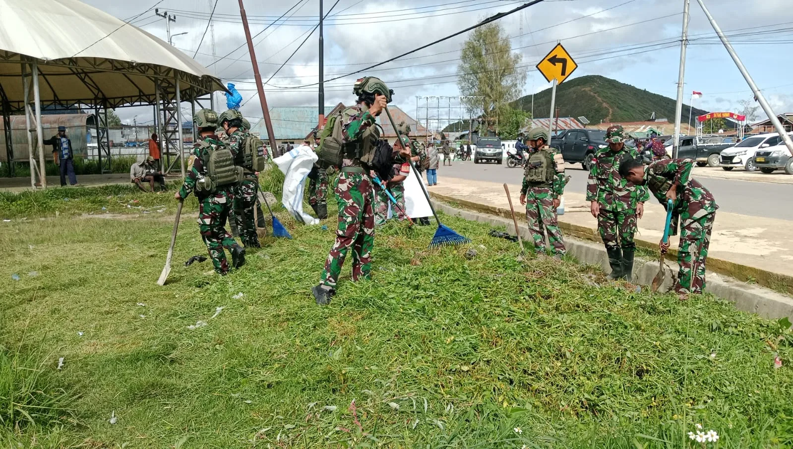 Paniai – Dalam rangka mendukung arahan Presiden Republik Indonesia terkait peningkatan kebersihan lingkungan dan penguatan sinergitas TNI bersama masyarakat, anggota Koramil 1703-01/Enarotali bersama Satgas Yonif 4 Marinir dan Satgas Yonif 711/RKS melaksanakan kegiatan kerja bakti pembersihan fasilitas umum di wilayah Kabupaten Paniai. Kamis (26/2/2026).