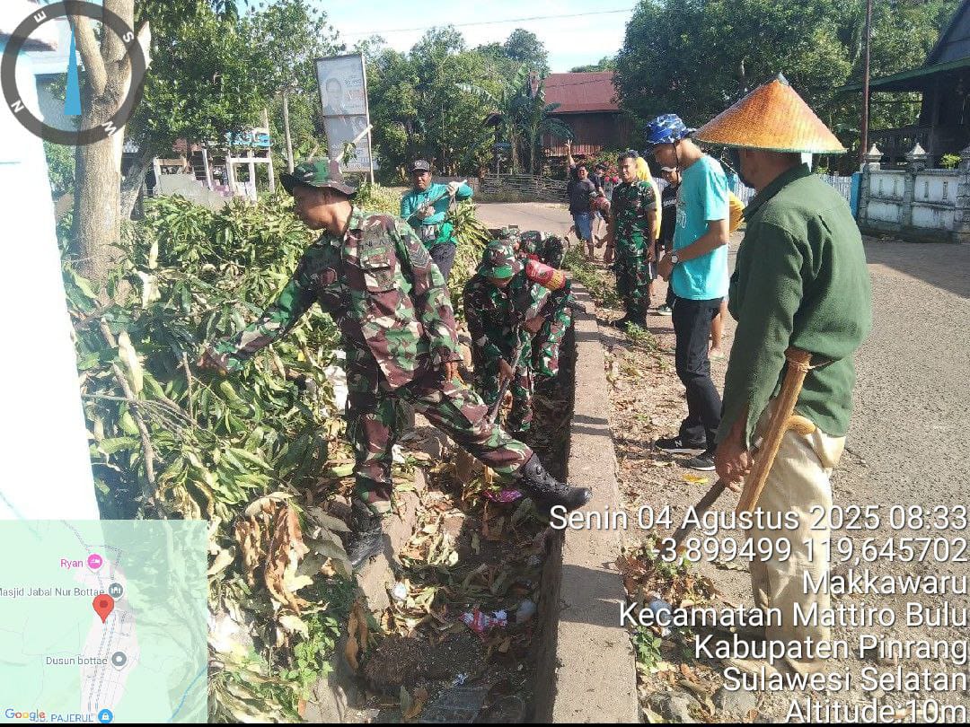 Pinrang_ Untuk mencegah terjadi banjir saat hujan, Babinsa Koramil-03/Mattiro Bulu Kodim 1404/Pinrang melaksanakan kerja bakti membersihkan saluran air bersama warga di Dusun Bottae Desa Makkawaru Kecamatan Mattiro Bulu Kabupaten Pinrang, Senin (04/08/2025).