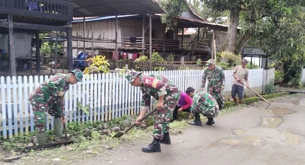 Anggota Koramil bersama warga bahu-membahu membersihkan sampah dan endapan lumpur yang menyumbat saluran air di lingkungan pemukiman. Kerja bakti ini juga bertujuan untuk menumbuhkan kesadaran masyarakat akan pentingnya menjaga kebersihan lingkungan secara berkelanjutan.
