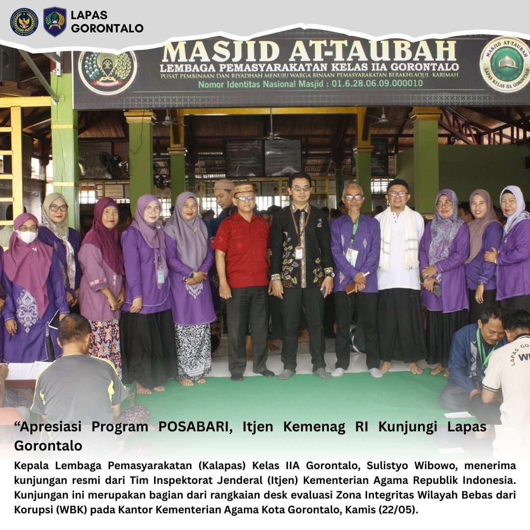 Kepala Lembaga Pemasyarakatan (Kalapas) Kelas IIA Gorontalo, Sulistyo Wibowo, menerima kunjungan resmi dari Tim Inspektorat Jenderal (Itjen) Kementerian Agama Republik Indonesia. Kunjungan ini merupakan bagian dari rangkaian desk evaluasi Zona Integritas Wilayah Bebas dari Korupsi (WBK) pada Kantor Kementerian Agama Kota Gorontalo, Kamis (22/05)