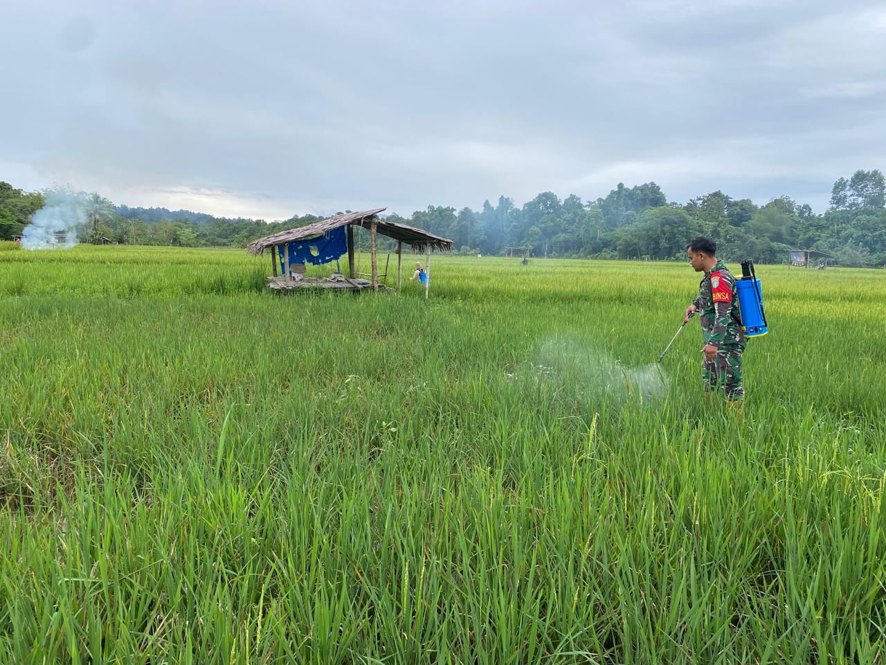 Di sela kegiatan melakukan penyemprotan hama pada tanaman padi, Sertu Rahnanda mengungkapkan bahwa kegiatan pendampingan terhadap petani merupakan upaya TNI membantu petani dalam mewujudkan swasembada pangan.