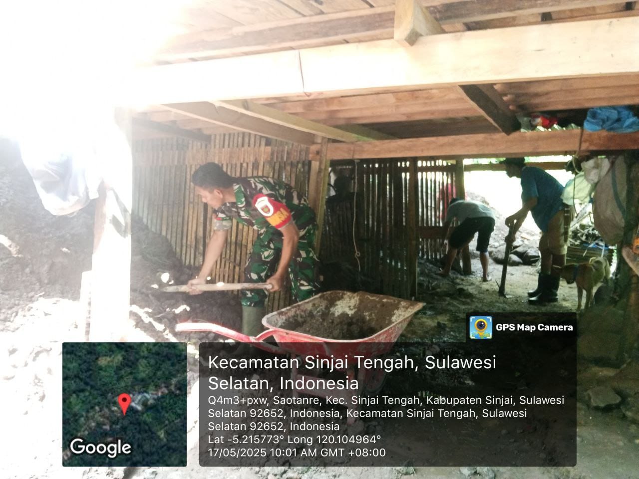 Sinjai – Babinsa Koramil 1424-03/Sinjai Tengah, Kopda Supriadi, bersama masyarakat melaksanakan kerja bakti membersihkan material tanah longsor yang menimpa salah satu rumah warga binaan di Dusun Saukang, Desa Saotanre, Kecamatan Sinjai Tengah, Kabupaten Sinjai, Sabtu (17/05/2025).