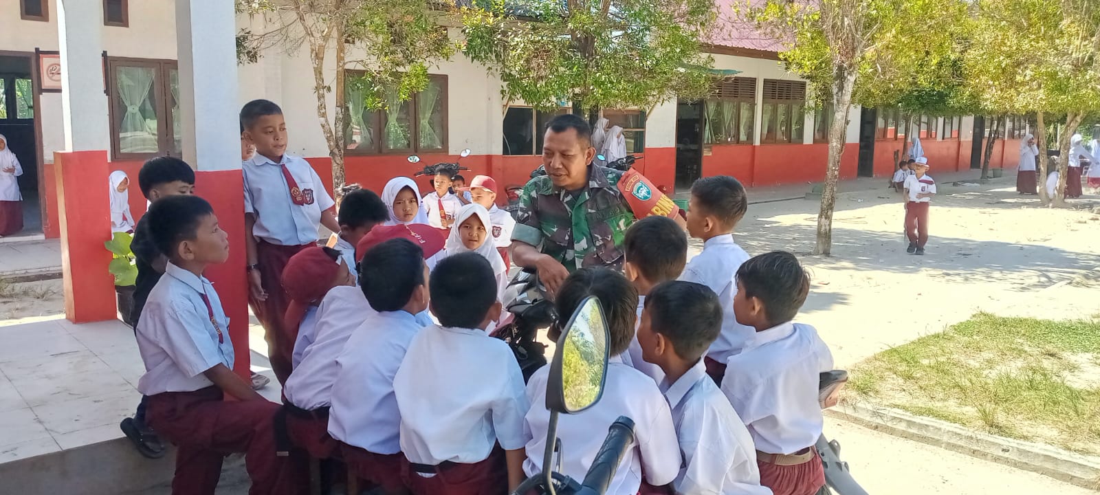 Babinsa Koramil 02/Simeulue Tengah Kodim 0115/Simeulue Sertu Rahimuddin memberikan edukasi wawasan kebangsaan melalui komunikasi sosial (komsos) dengan siswa-siswi SD Negeri 1 Simeulue Tengah. (03/06/2025).