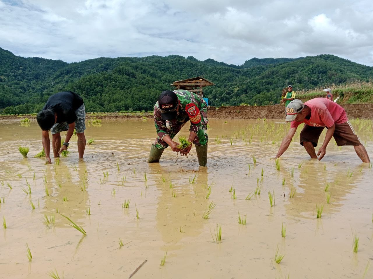 Kegiatan ini dilakukan bersama Puang Duding, salah satu anggota kelompok tani “Jampua”, yang tengah mengelola lahan seluas 1,5 hektare. Pendampingan tersebut merupakan bagian dari tugas Babinsa dalam mendukung program swasembada pangan serta mempererat kemitraan antara TNI dan petani setempat.