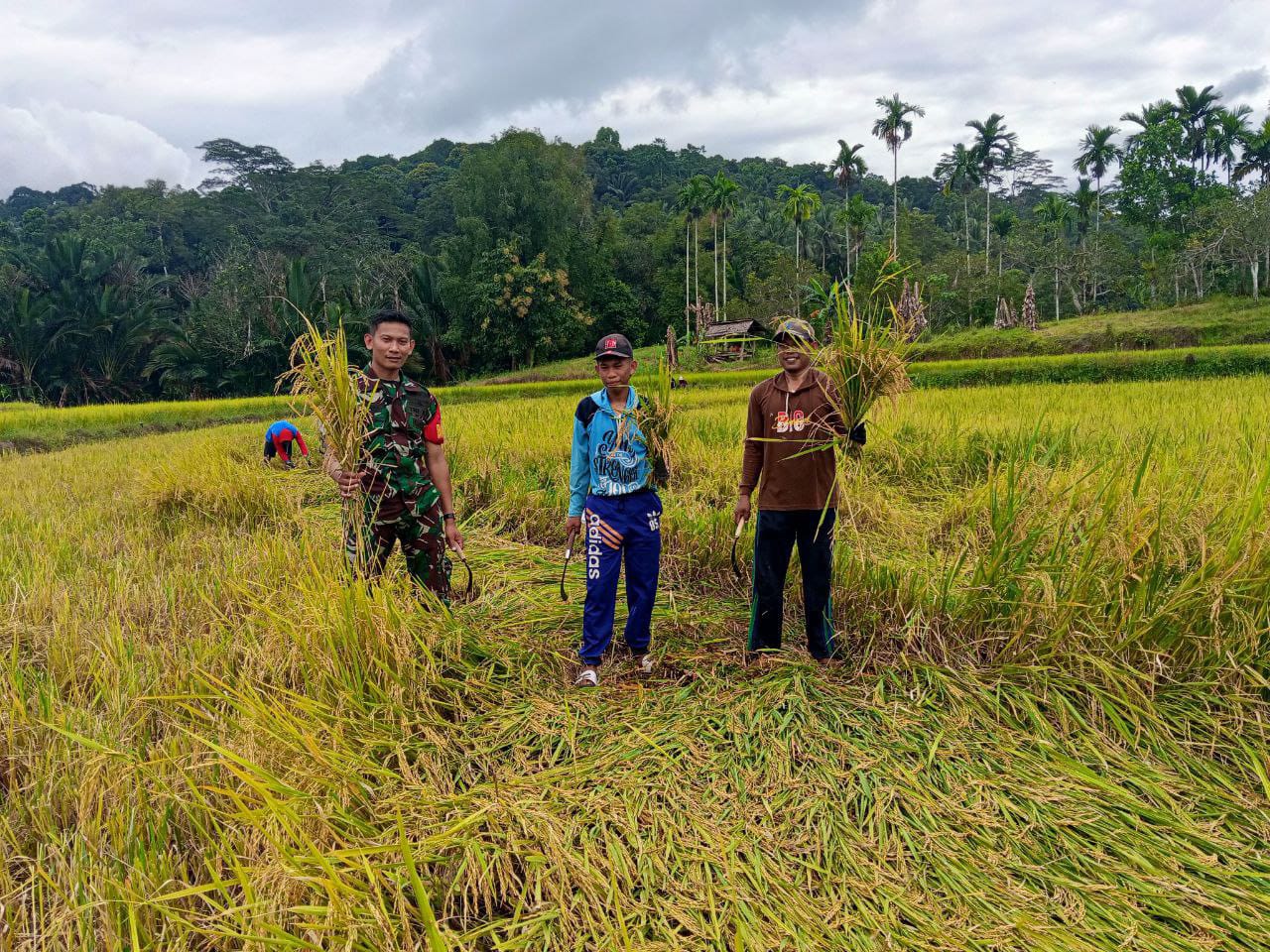 SINJAI. Babinsa Desa Saotanre Koramil 1424-03/Sinjai Tengah, Kopda Supriadi, melaksanakan kegiatan pemantauan sekaligus pendampingan panen padi di area Kelompok Tani Masyo Jampu milik Bapak Bahri yang berlokasi di Dusun Barae, Desa Saotanre, Kecamatan Sinjai Tengah.(02/09/2025