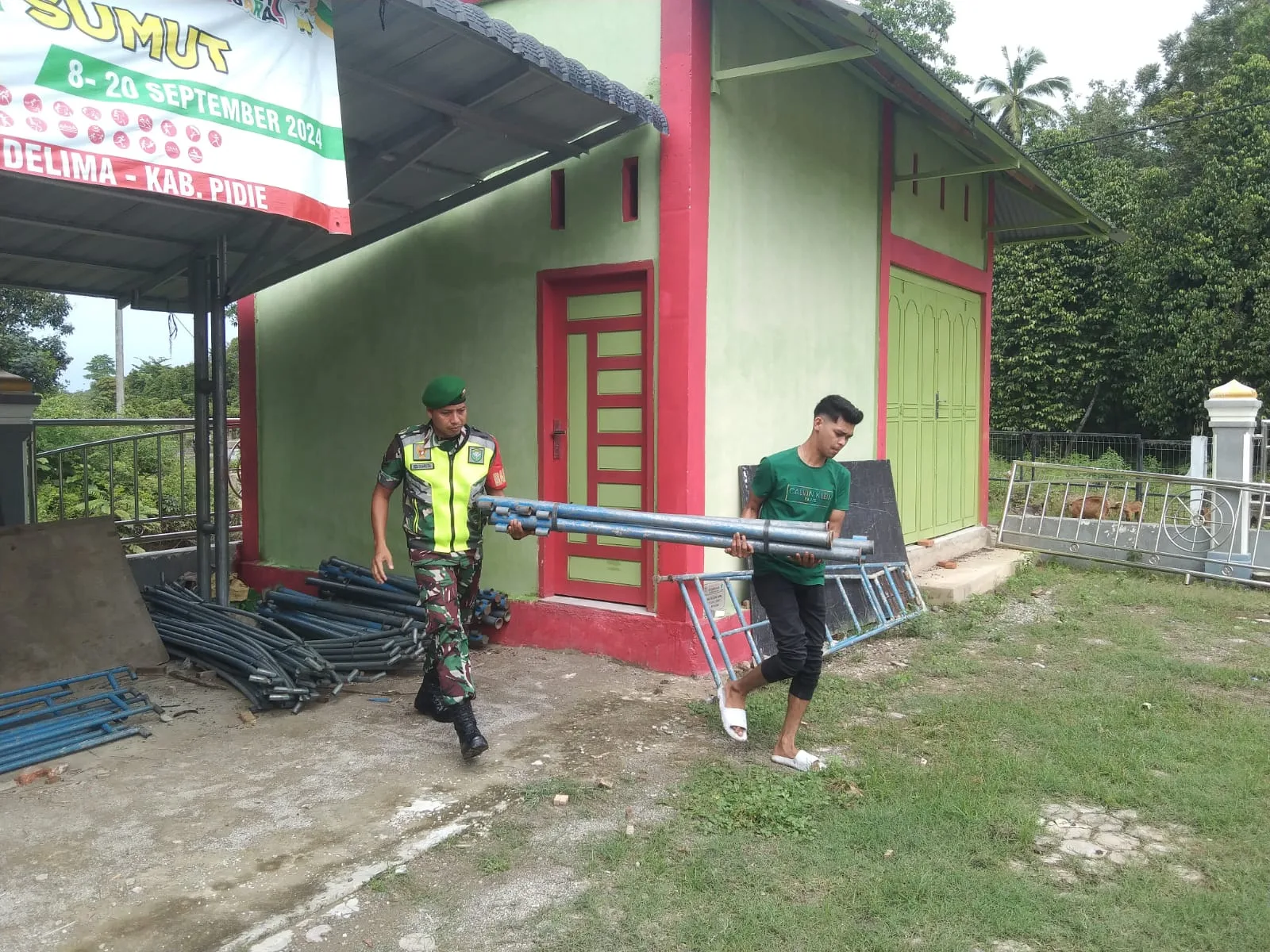 Kegiatan tersebut meliputi pembersihan lingkungan sekitar rumah, pemasangan tenda, hingga penataan perlengkapan yang akan digunakan dalam acara.