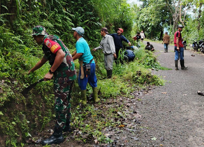Sinjai. Babinsa Desa Saotanre Koramil 1424-03/Sinjai Tengah, Kopda Supriadi, bersama Kepala Dusun dan masyarakat, melaksanakan kerja bakti dengan sasaran pembersihan jalan dan drainase dari material tanah dan sampah.(31/07/2025)