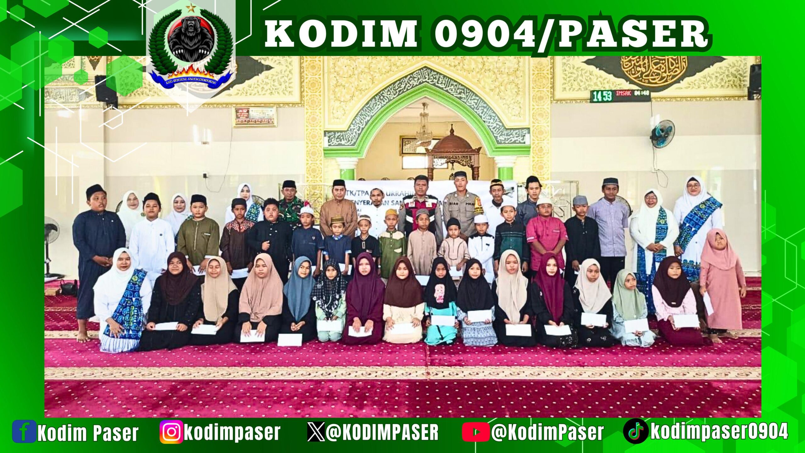 Kodim 0904/Psr, Korem 091/ASN, Kodam VI/Mlw – Babinsa Desa Muser Sertu Wahono mengikuti kegiatan Penyerahan Bantuan Santunan Anak Yatim Piatu bertempat di Masjib Baiturohman Desa Muser, Kec. Muara Samu, Kab. Paser. Selasa (8/7/2025)