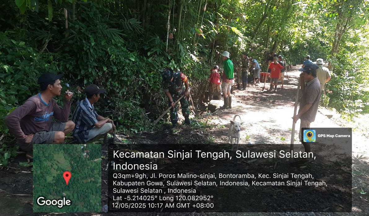 Sinjai – Babinsa Desa Pattongko Koramil 1424-03/Sinjai Tengah, Serda Asri Bahe, bersama Kepala Dusun dan masyarakat Dusun Karoppa, Desa Pattongko, melaksanakan kegiatan kerja bakti membersihkan dan memperbaiki parit di sepanjang jalan tani, Kegiatan ini dilakukan sepanjang 150 meter sebagai bagian dari upaya bersama membangun infrastruktur pedesaan, Senin (12/05/2025).