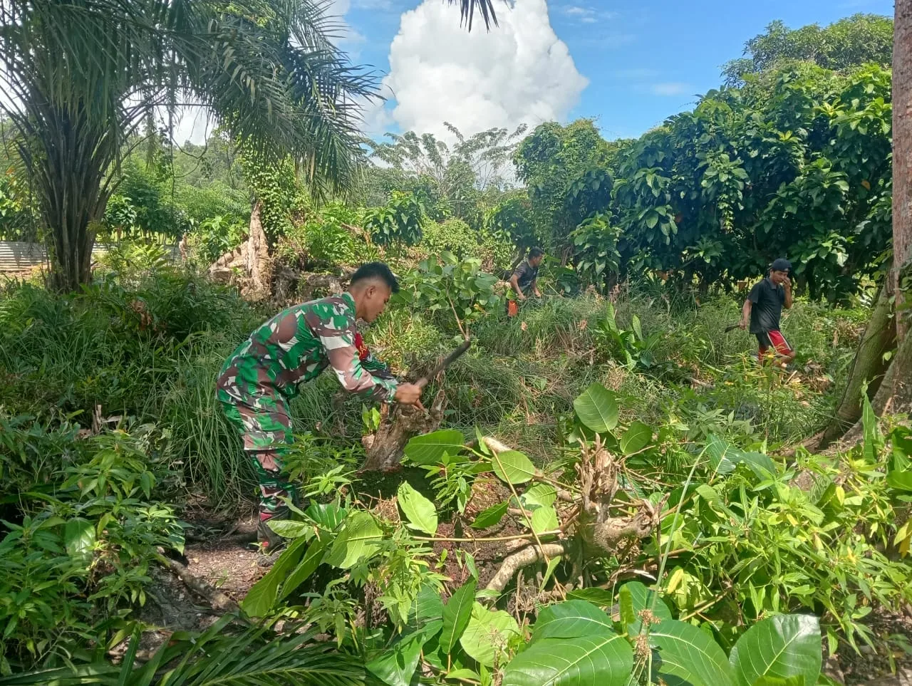 Simeulue – Sertu Joy Darsa Babinsa Koramil 04/Tepsel, Kodim 0115/Simeulue, Korem 012/Teuku Umar Bersama bersama aparat desa melaksanakan giat gotong royong di Kantor Desa Labuan Bhakti, Kecamatan Teupah Selatan, Kabupaten Simeulue. Minggu (07/12/2025)