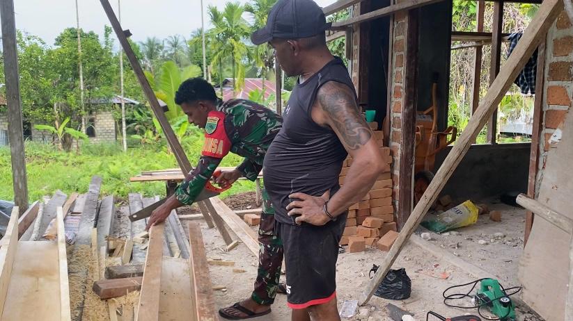Raja Ampat, PBD– Babinsa Koramil 1805-01/Waisai, Kodim 1805/Raja Ampat, Pratu Steven mambrasar Melaksanakan kegiatan Karya Bakti dengan mendampingi sekaligus membantu Warga Desa Binaan Membangun Bangunan Rumah di Kampung Saugrai, Distrik Mios manswar, Kabupaten Raja Ampat, Selasa (17/06/2025).