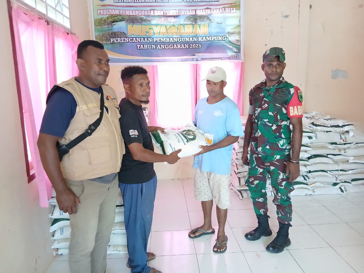 Raja Ampat ,PBD-Bertempat di kantor kelurahan Sapordanco l Distrik Waisai kota,Babinsa Koramil 1805-01/Waisai kota,Sertu Abdula melakasanakan kegiatan pendampingan pembagian dan penyaluran beras kepada masyarakat .