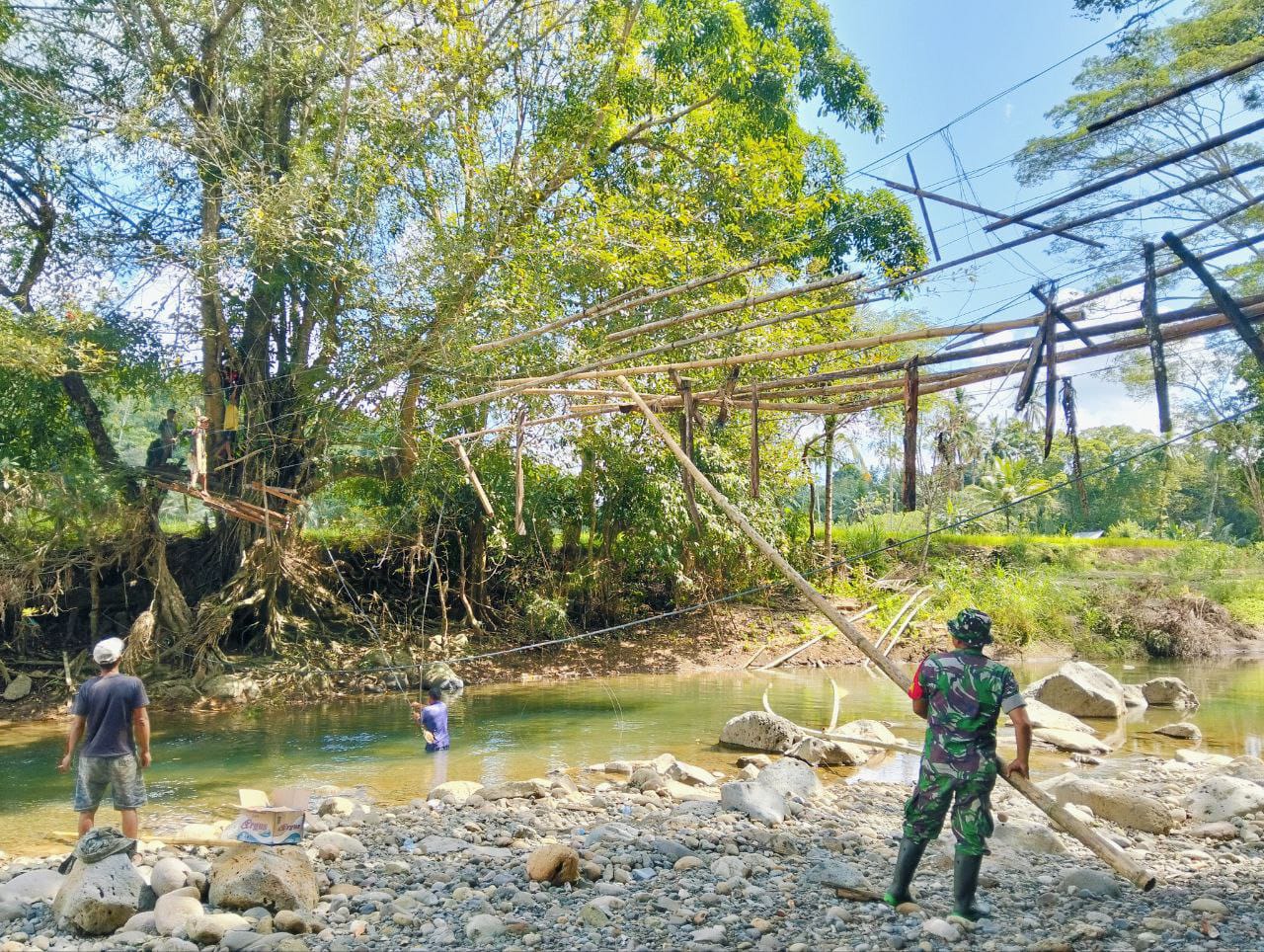 SINJAI. Babinsa Kelurahan Samaenre Koramil 1424-03/Sinjai Tengah, Serka Nasaruddin bersama Kepala Lingkungan dan masyarakat setempat melaksanakan kegiatan gotong royong pembangunan jembatan darurat di Lingkungan Lonra 2, Kelurahan Samaenre, Kecamatan Sinjai Tengah, Senin (28/07/2025).