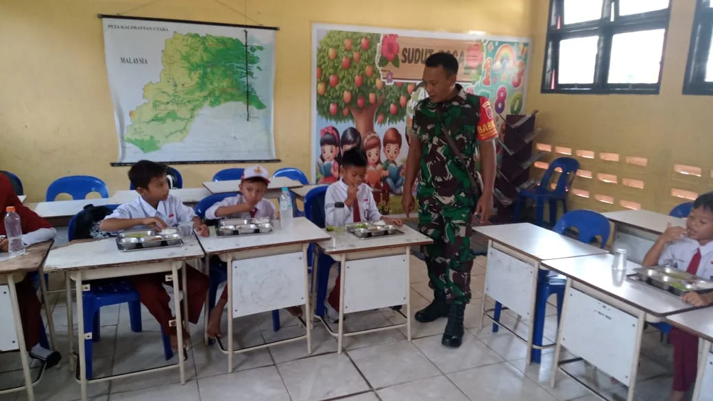 Tarakan – Sebagai bentuk dukungan terhadap program pemerintah dalam meningkatkan kesehatan dan kesejahteraan masyarakat, khususnya siswa-siswi di sekolah.Babinsa Jajaran Kodim 0907/Trk aktif membantu pengawasan MBG seperti di SDN 019 Tarakan.