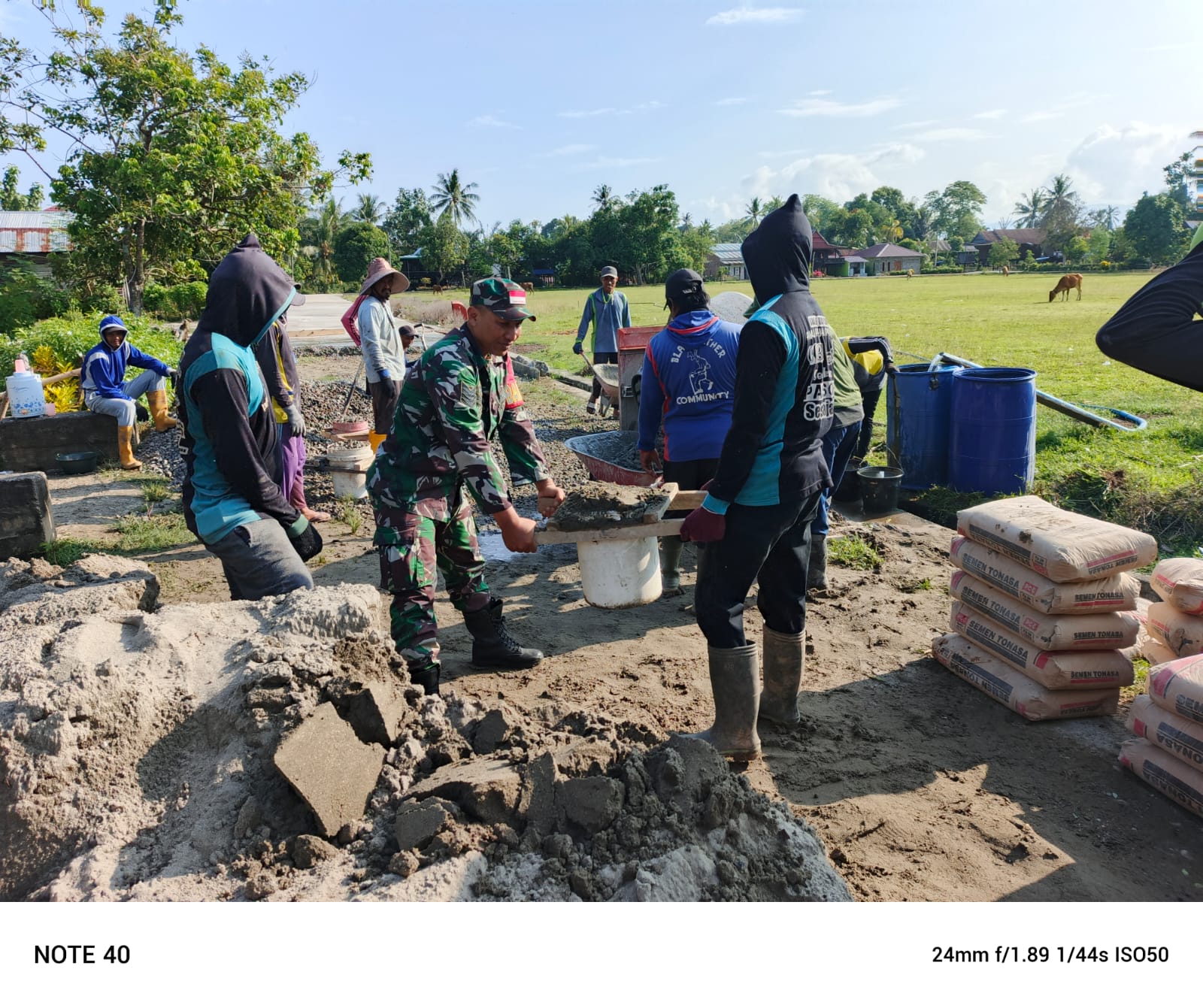 Pada gotong royong tersebut, Serma Edy Purwanto memegang gerobak untuk membawa material bersama warga. Material itu untuk memperkeras jalan desa di wilayah binaan.