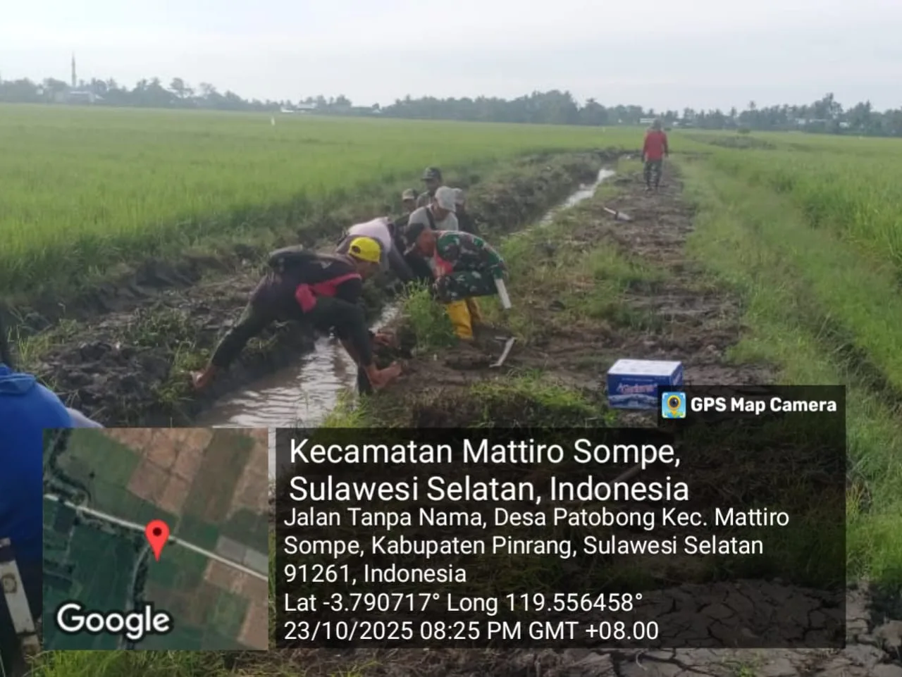 Pinrang_ Babinsa Koramil 1404-02/Mattiro Sompe Kodim 1404/Pinrang bersama warga masyarakat melaksanakan kegiatan kerja bakti pembersihan saluran air persawahan yang bertempat di Dusun Tanete, Desa Patobong, Kecamatan Mattiro Sompe, Kabupaten Pinrang, Kamis (23/10/2025).