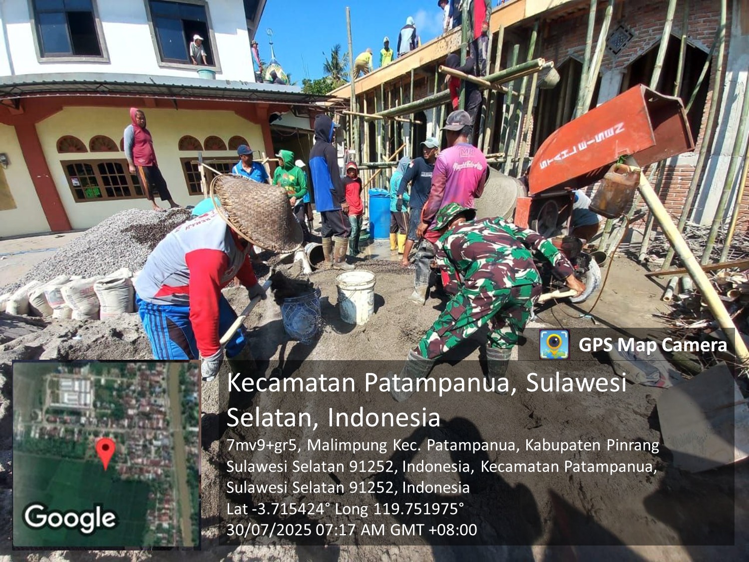 Pinrang_ Wujud kepedulian TNI terhadap pembangunan sarana ibadah masyarakat ditunjukkan oleh Babinsa Koramil-05/Patampanua Kodim 1404/Pinrang Sertu Deni Agus Subroto yang melaksanakan kegiatan gotong-royong bersama warga dalam pengecoran lantai atas Masjid Nurul Amrullah di Desa Malimpung Kecamatan Patampanua Kabupaten Pinrang, Rabu (30/07/2025).
