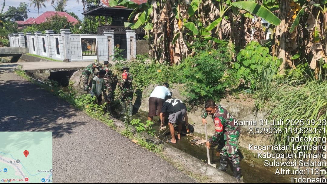 Pinrang_ Untuk meningkatkan ketahanan pangan, Babinsa jajaran Koramil-07/Lembang Kodim 1404/Pinrang melaksanakan kerja bakti bersama warga dengan sasaran membersihkan saluran irigasi di Kampung Tuppu Kelurahan Tadokkong Kecamatan Lembang Kabupaten Pinrang, Kamis (31/07/2025).