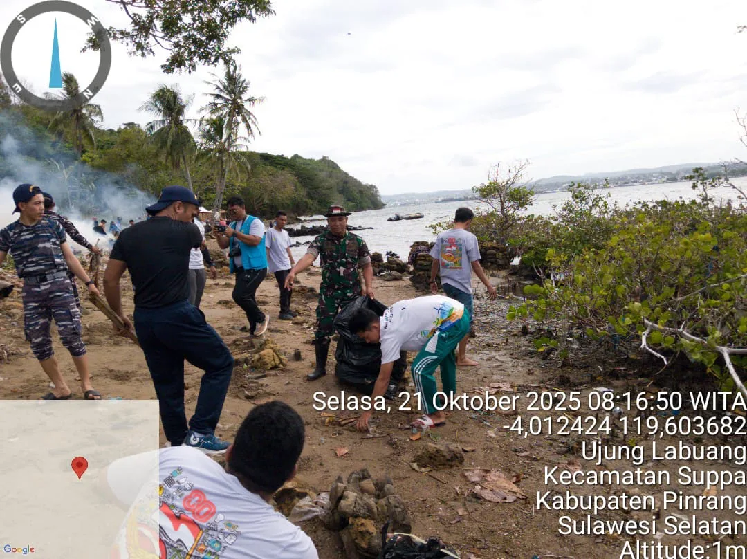 Pinrang_ Babinsa jajaran Koramil 01/Suppa Kodim 1404/Pinrang bersama stakeholder terkait melaksanakan kerja bakti pembersihan pantai yang berlokasi di Dusun Tanamilie, Desa Labuang, Kecamatan Suppa, Kabupaten Pinrang, Selasa (21/10/2025).