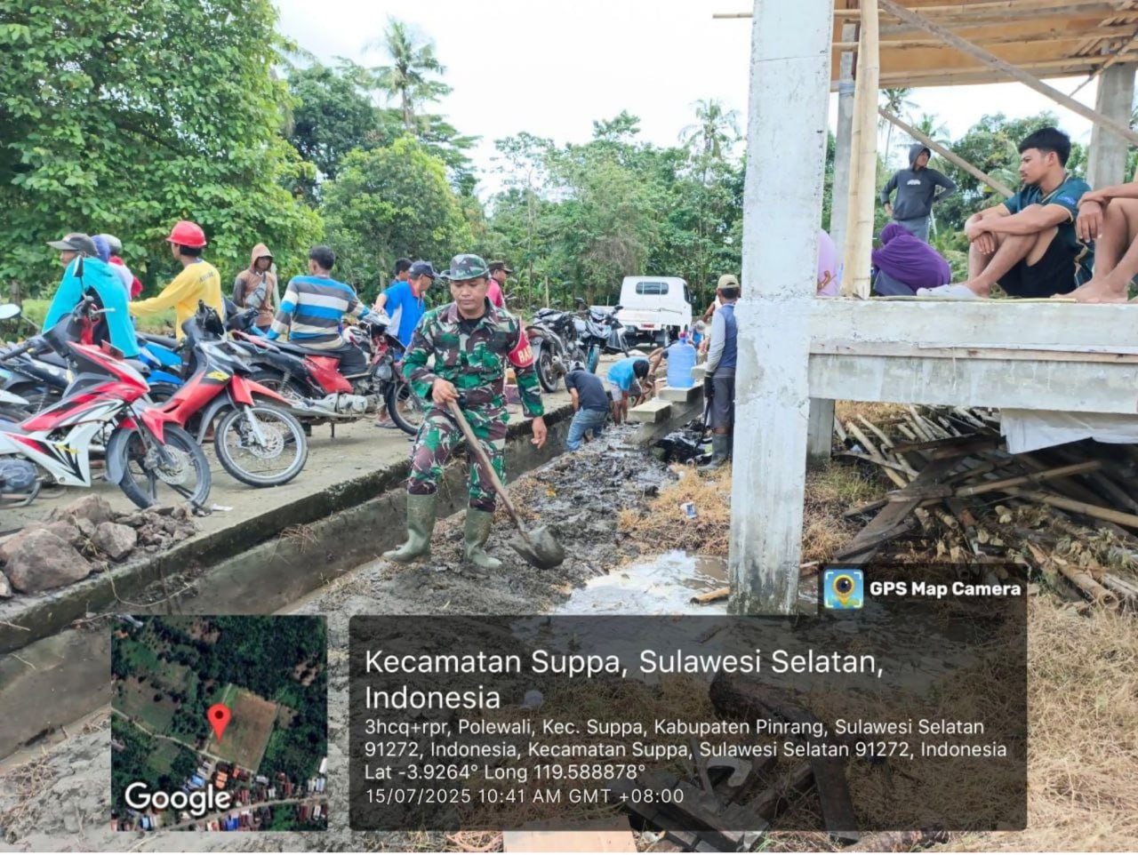 Pinrang_ Dukung Ketahanan pangan, Babinsa Koramil-01/Suppa Kodim 1404/Pinrang Sertu Arief Budi berbaur bersama Staf Desa dan warga melaksanakan kerja bakti pembersihan saluran irigasi di Dusun Belabelawa Desa Polewali Kecamatan Suppa Kabupaten Pinrang, Rabu (16/07/2025).