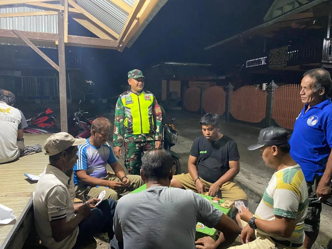 Pinrang_ Babinsa Koramil-03/Mattiro Bulu Kodim 1404/Pinrang Sertu Mansur melaksanakan patroli malam sekaligus komunikasi sosial (komsos) dengan warga yang berjaga di pos keamanan lingkungan Desa Pananrang Kecamatan Mattiro Bulu Kabupaten Pinrang, Minggu (12/10/2025).
