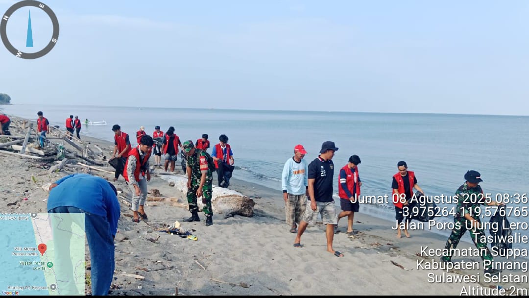 Pinrang_ Peduli kebersihan Lingkungan, Babinsa Koramil-01/Suppa Kodim 1404/Pinrang bersama Forkopimcam dan stake holder terkait lainnya dan warga setempat mengadakan kegiatan kerja bakti pembersihan pesisir Lowita di Desa Tassiwalie Kecamatan SUppa Kabupaten Pinrang, Sabtu (09/08/2025).
