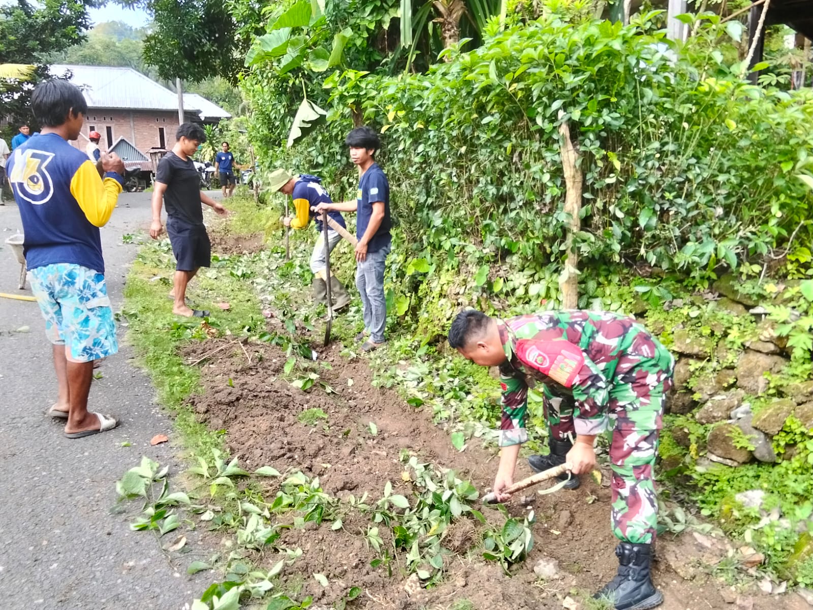 Kodim 1419/Enrekang Praka Helmi Babinsa koramil 02/Enrekang bersama masyarakat melaksanakan karya bakti membersihkan selokan dan tepi jalan sepanjang 150 meter di Lingk. Barani Kel. Tuara Kec. Enrekang Kab. Enrekang, Kamis (10/07/2025).