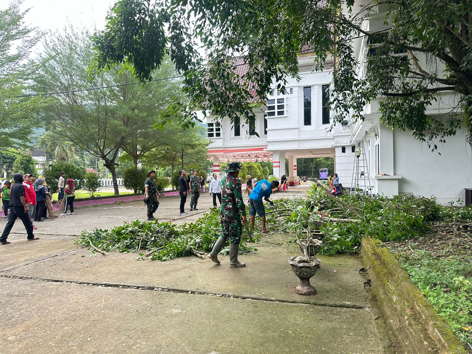 Danramil 1419-02/Enerkang Kapten Inf Zainal Bandaso mengatakan kegiatan kerja bakti pembersihan ranting-ranting dan memotong serta memangkas pohon yang ada di halaman sekitar kantor Kantor bupati yang sudah menutupi pandangan kantor.