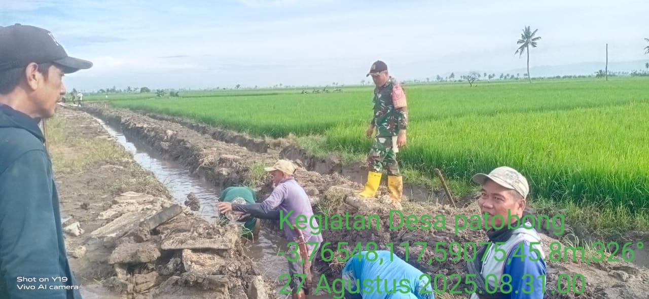 Pinrang_ Penuhi kebutuhan air persawahan petani, Babinsa Koramil-02/Mattiro Sompe Kodim 1404/Pinrang Serka Mustamin berbaur bersama warga melaksanakan gotong-royong pembersihan saluran irigasi di Desa Patobong Kecamatan Mattiro Sompe Kabupaten Pinrang, Rabu (27/08/2025).