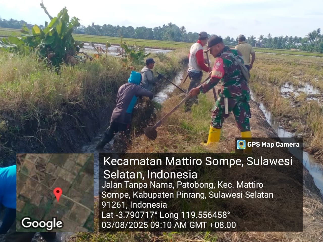 Pinrang_ Untuk memperlancar tahap pengolahan sawah, Babinsa Koramil-02/Mattiro Sompe Kodim 1404/Pinrang Serma Muhajir berbaur bersama warga melaksanakan gotong-royong pembersihan saluran irigasi di Dusun Labulang Desa Patobong Kecamatan Mattiro Sompe Kabupaten Pinrang, Minggu (03/08/2025).