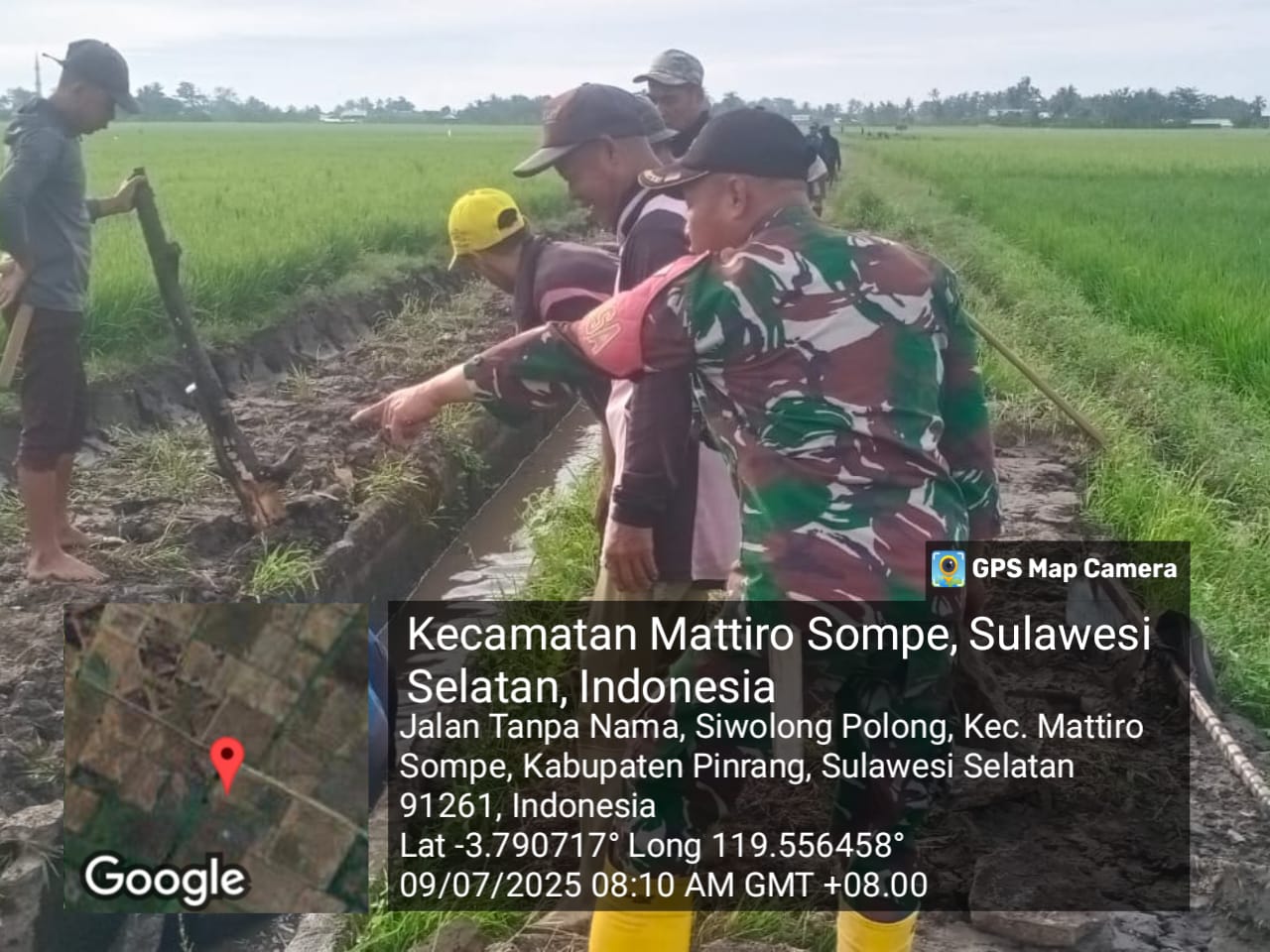 Pinrang_ Babinsa Koramil-02/Mattiro Sompe Kodim 1404/Pinrang Serka Mustaming bersama warga melaksanakan kegiatan kerja bakti membersihkan saluran irigasi di Dusun Kapa Desa Siwolong-polong Kecamatan Mattiro Sompe Kabupaten Pinrang, Rabu (09/07/2025).