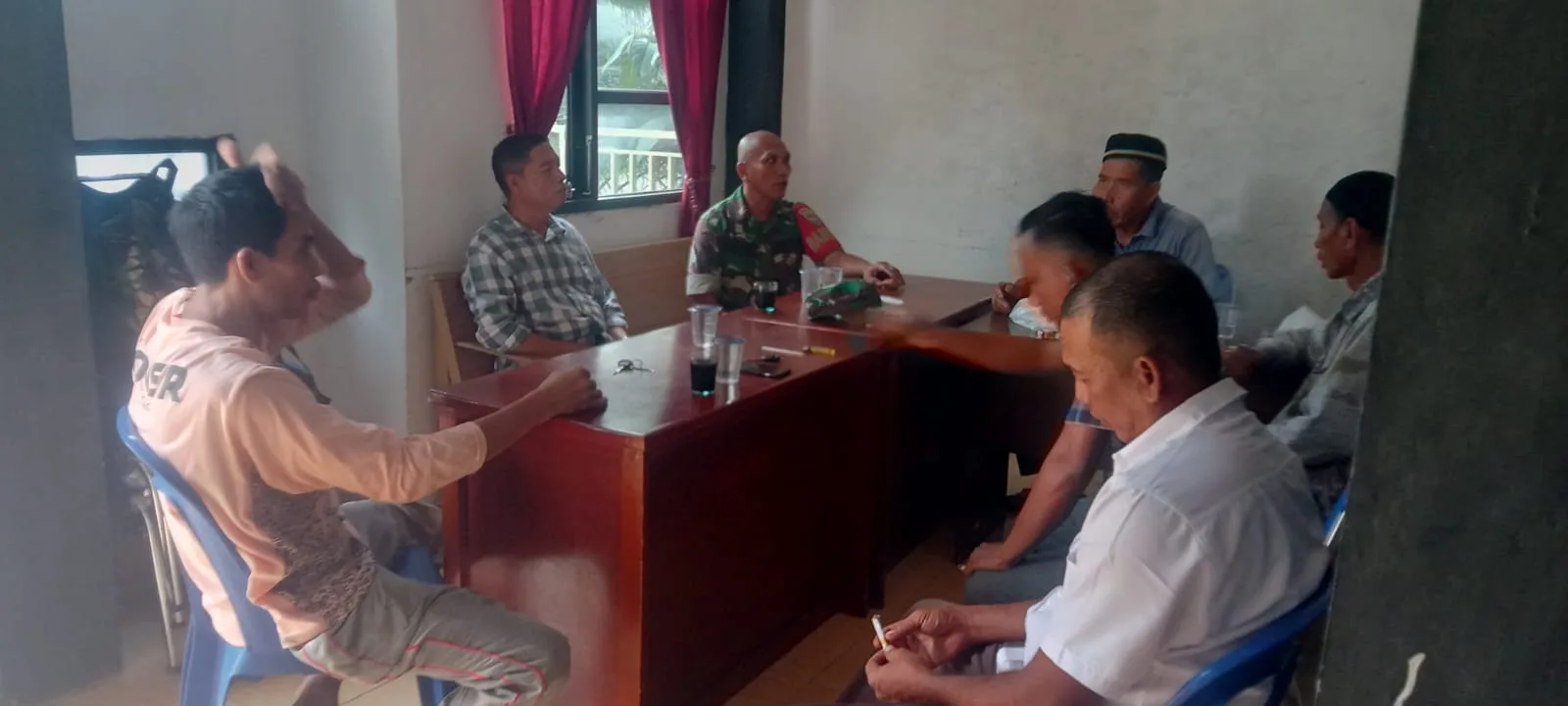 Dalam kesempatan tersebut, Babinsa berdialog langsung dengan aparatur desa setempat, salah satunya membahas berbagai hal terkait keamanan lingkungan dan peran aktif generasi muda dalam menjaga ketertiban desa.