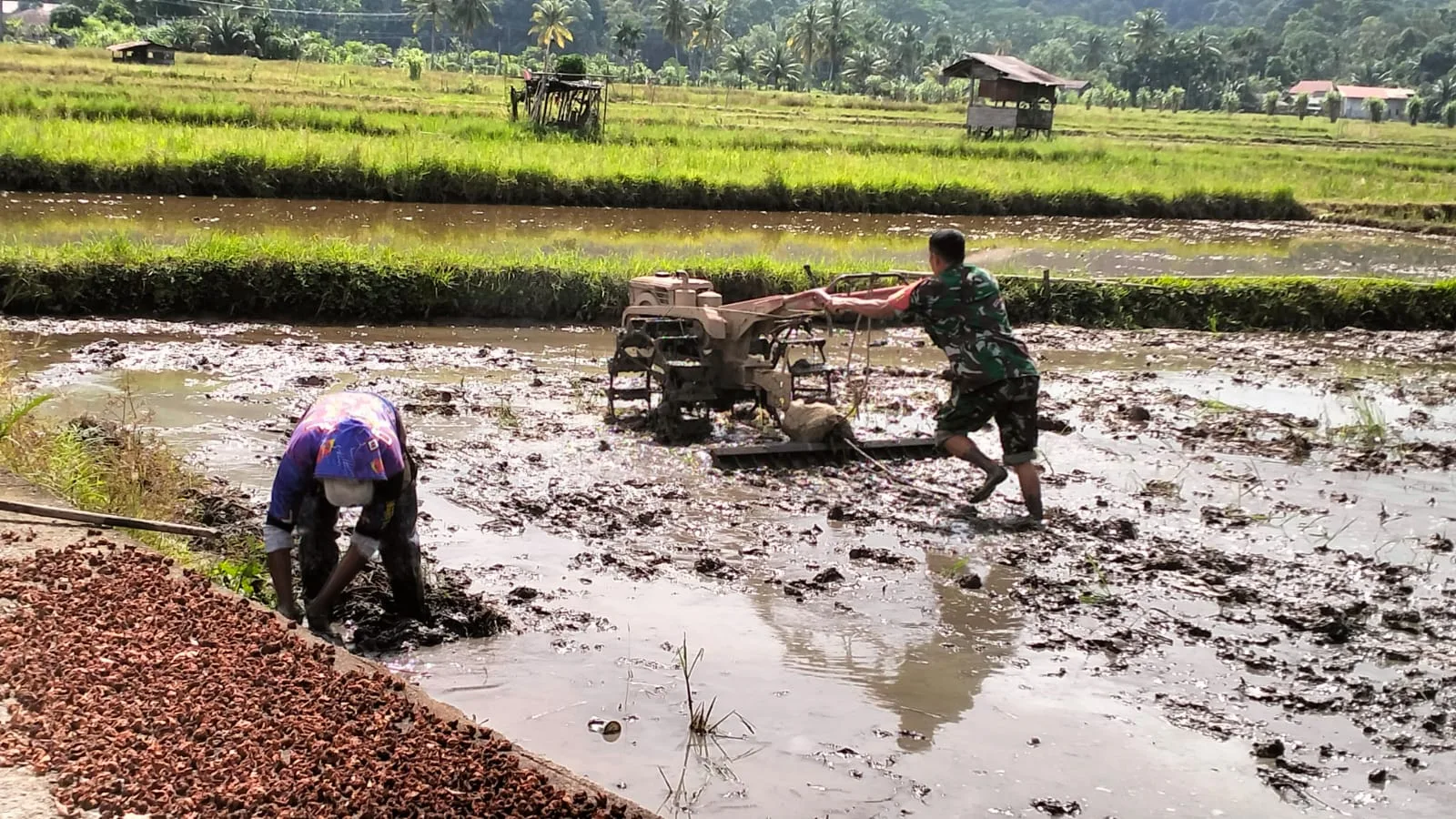 Meski medan berlumpur dan cuaca tidak menentu, langkah Sertu Rahmad tidak pernah surut. Ia bahu-membahu bersama petani, mulai dari meratakan tanah hingga memastikan persiapan lahan sesuai tahapan pertanian modern.