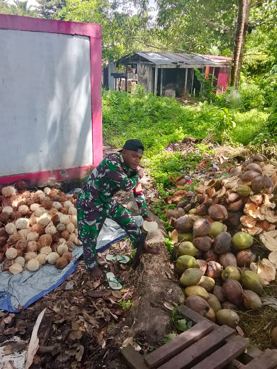 Pratu Apner Lapon mengatakan, tugas seorang Bintara Pembina Desa (Babinsa) bukan hanya menjaga wilayahnya saja, tetapi juga harus berkomunikasi dengan masyarakat serta melakukan pembinaan, dan tentu ikut serta membantu kesulitan masyarakat. Babinsa bersama warga Kampung membelah kelapa tua milik yohan Dimara.