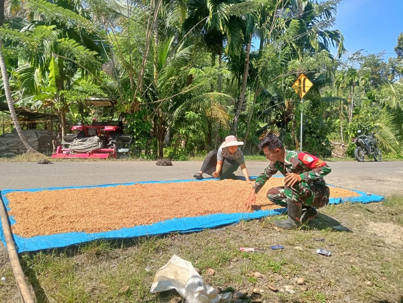 Sertu Joy Dharsa Babinsa Koramil 03/Teupah Selatan, Kodim 0115/Simeulue, Korem 012/Teuku Umar. Melaksanakan komsos membantu warga menjemur padi hasil panen dari sawah mereka sendiri, Kegiatan ini biasanya dilakukan sebelum di bawa ke tempat penggilingan untuk di jadikan beras di Desa Latiung, Kecamatan Teupah Selatan, Kabupaten Simeulue. Selasa (17/02/2026).