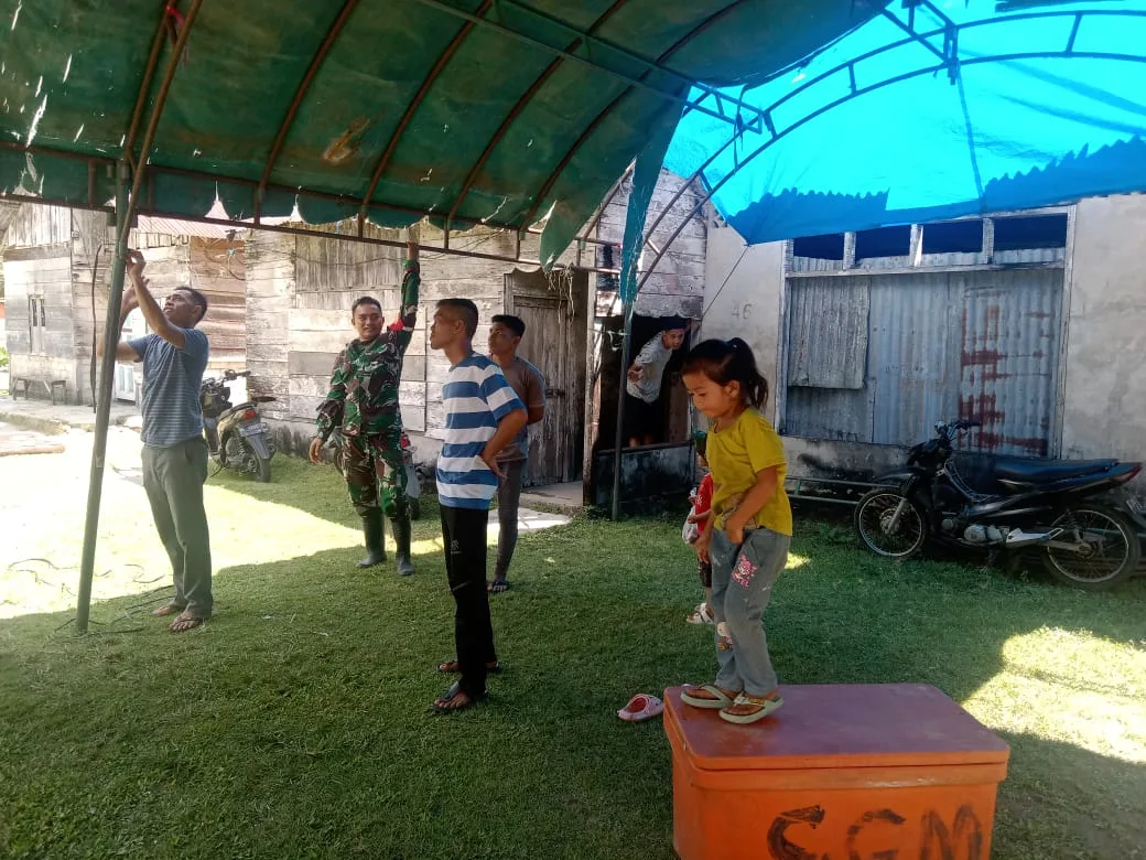 Babinsa Koramil 03/Teupah Selatan, Kodim 0115/Simeulue, Korem 012/Teuku Umar. Praka Darmansyah bersama pemuda dan warga di desa binaan melaksanakan kegiatan gotong royong pemasangan teratak yang akan di gunakan dalam rangka acara pesta sunatan salah satu anak warga di Desa Labuan Bhakti, Kecamatan Teupah Selatan, Kabupaten Simeulue. Minggu (11/01/2026).