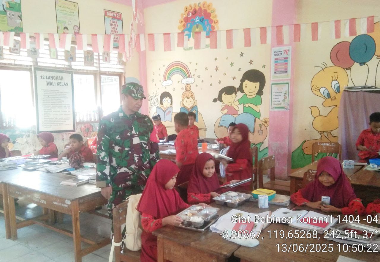 Pinrang_ Babinsa Koramil-04/Paleteang Kodim 1404/Pinrang Sertu Edy melaksanakan pemantauan kegiatan makan bergizi gratis di SDN 161 Pinrang Kelurahan Maccorawalie Kecamatan Watang Sawitto Kabupaten Pinrang, Sabtu (14/06/2025).