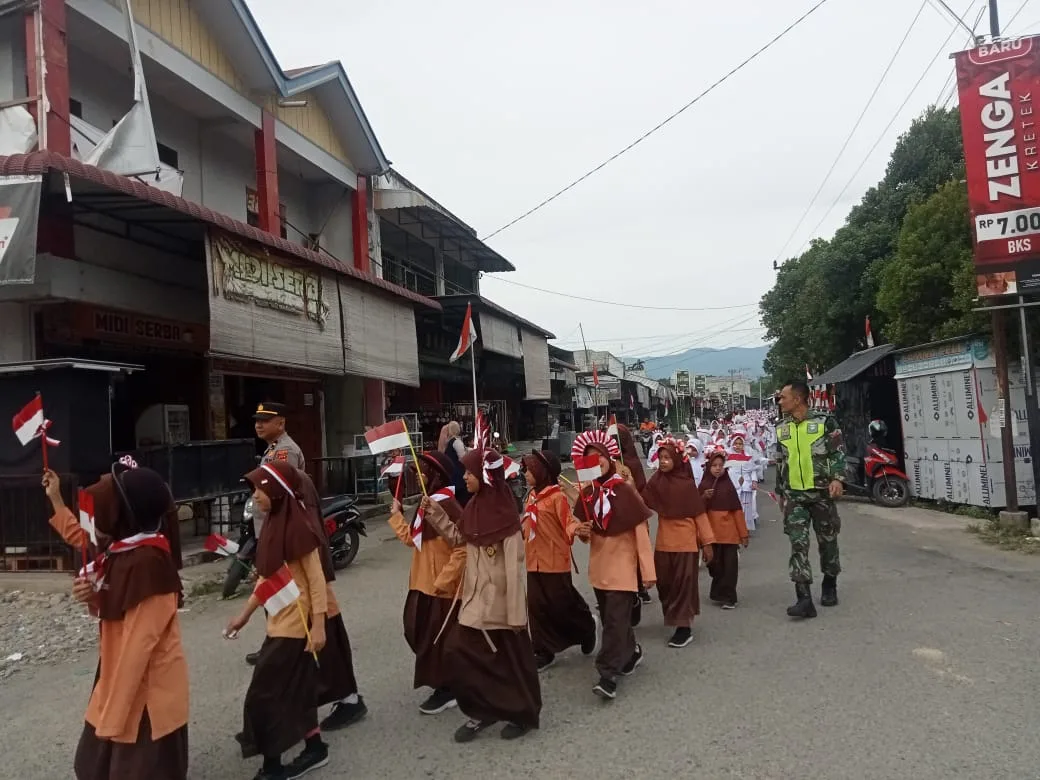 Selama pawai berlangsung, Babinsa turut mengatur jalur peserta, memberikan arahan singkat mengenai keselamatan, dan berkoordinasi dengan pihak sekolah untuk memastikan seluruh siswa mengikuti kegiatan dengan tertib hingga selesai.