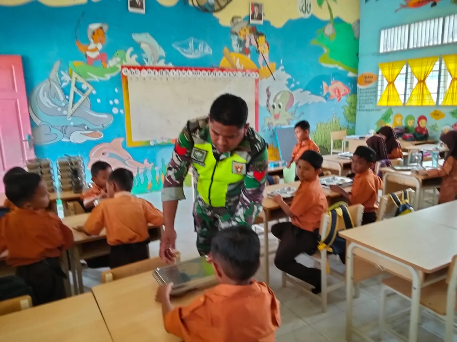 Anggota Koramil 05/Indra Jaya, Kopka Hasibuan, secara langsung terlibat dalam kegiatan pendistribusian MBG kepada murid-murid SDN Lhok Kaju.
