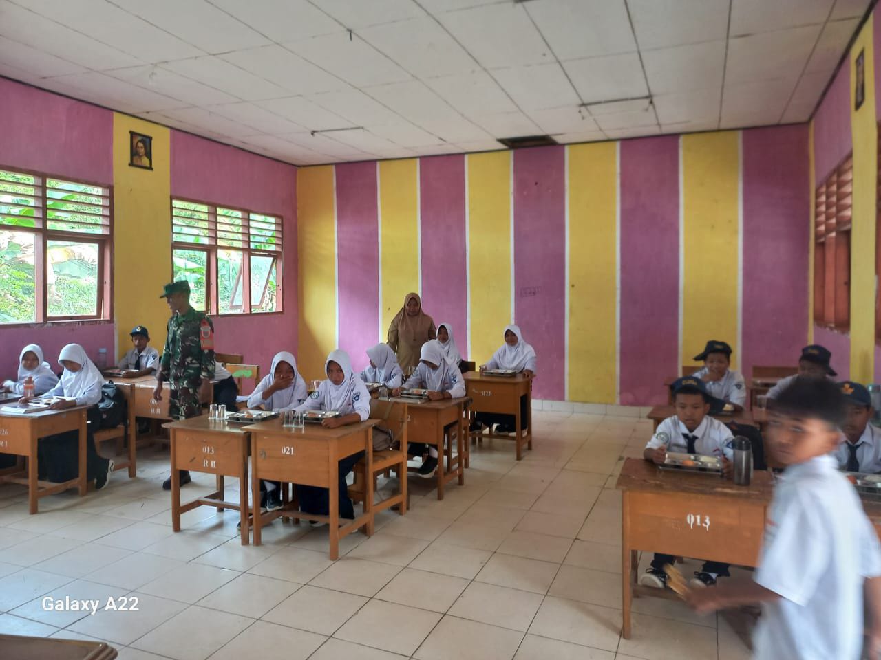 Pinrang_ Pastikan berjalan lancar, Babinsa Koramil-05/Patampanua Kodim 1404/Pinrang Sertu Deni Agus Subroto melakukan pendampingan pembagian program Makan Bergizi Gratis (MBG) di SMP Negeri 5 Pinrang yang terletak di Desa Malimpung Kecamatan Patampanua Kabupaten Pinrang, Rabu (27/08/2025).