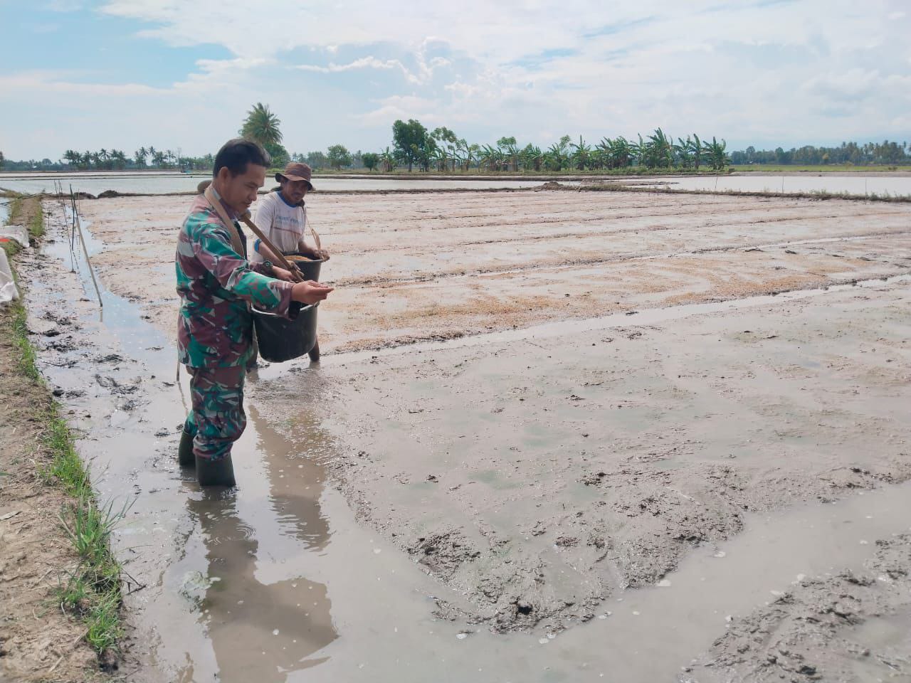 Pinrang_ Babinsa Koramil-06/Duampanua Kodim 1404/Pinrang Sertu Agus membantu salah satu petani menaburkan Bibit Padi di persawahan kelompok tani Tosalame di Lingkungan Taman Sari Kelurahan Tatae Kecamatan Duampanua Kabupaten Pinrang, Sabtu (28/06/2025).