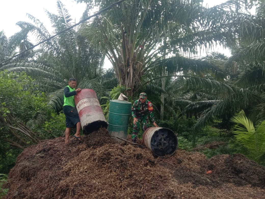 Babinsa Serda Edi turut serta dalam membantu warga membongkar ampas nilam yang telah disuling, yang nantinya akan digunakan sebagai pupuk organik atau bahan bakar alternatif.