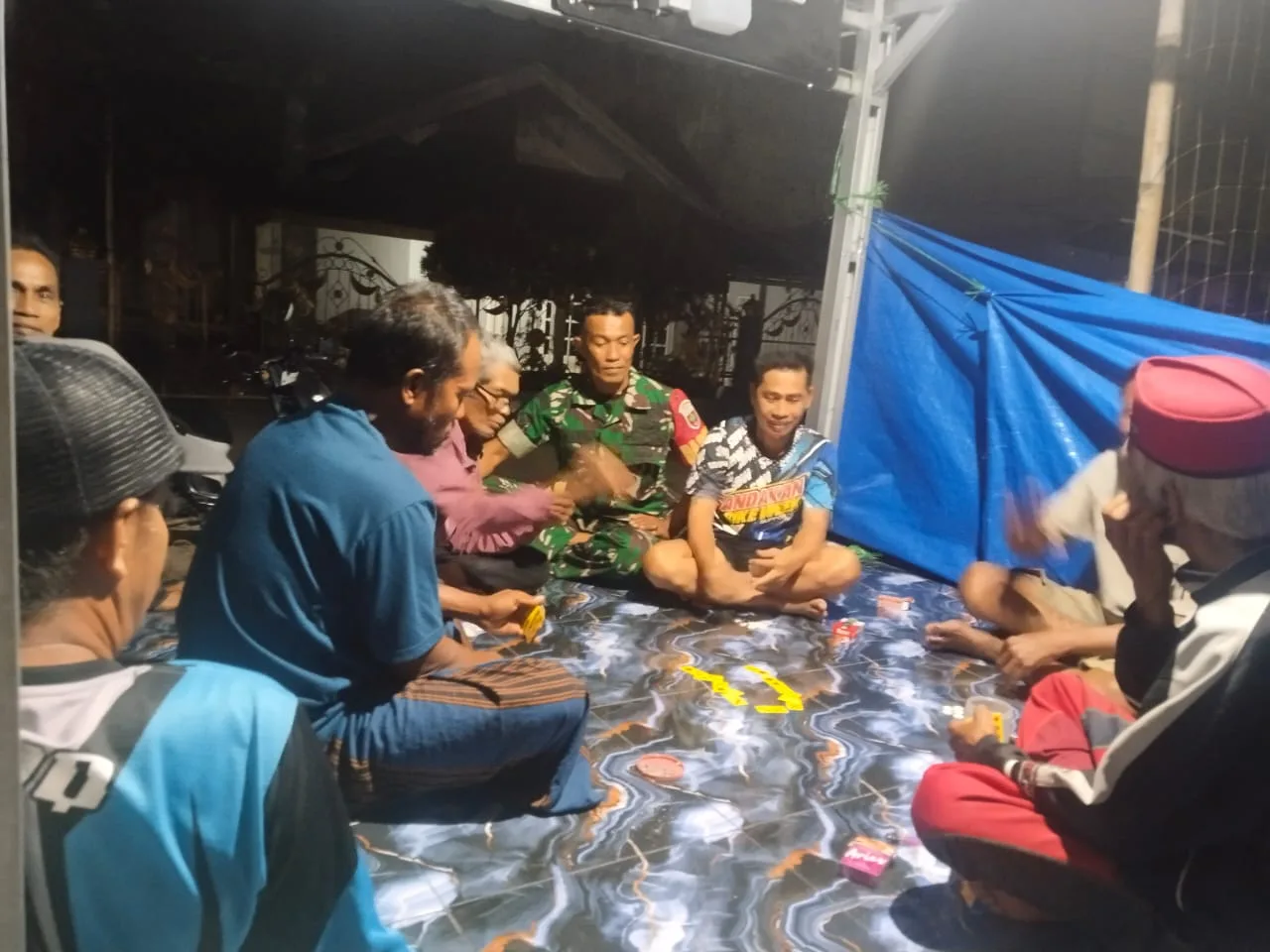 Duampanua_ Babinsa Koramil-06/Duampanua Kodim 1404/Pinrang Sertu Irwan melaksanakan kegiatan pemantauan wilayah binaan dan komsos dengan warga yang sedang melaksanakan ronda malam di Desa Barugae, Kecamatan Duampanua, Kabupaten Pinrang, Senin (06/10/2025).