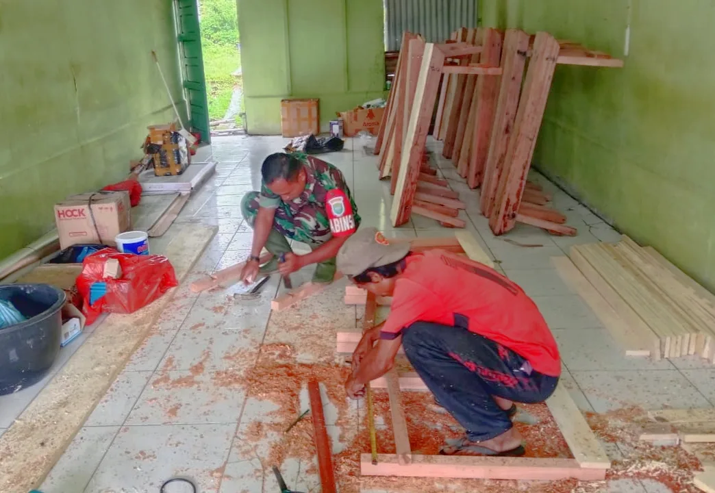 Babinsa Koramil 06/Teluk Dalam Serda Yatno melaksanakan monitor wilayah sekaligus membantu warga membuat meja dan kursi untuk membuka usaha warung kopi miliknya Desa Bulu Hadek, Kecamatan Teluk Dalam, Kabupaten Simeulue. Minggu (28/12/2025).