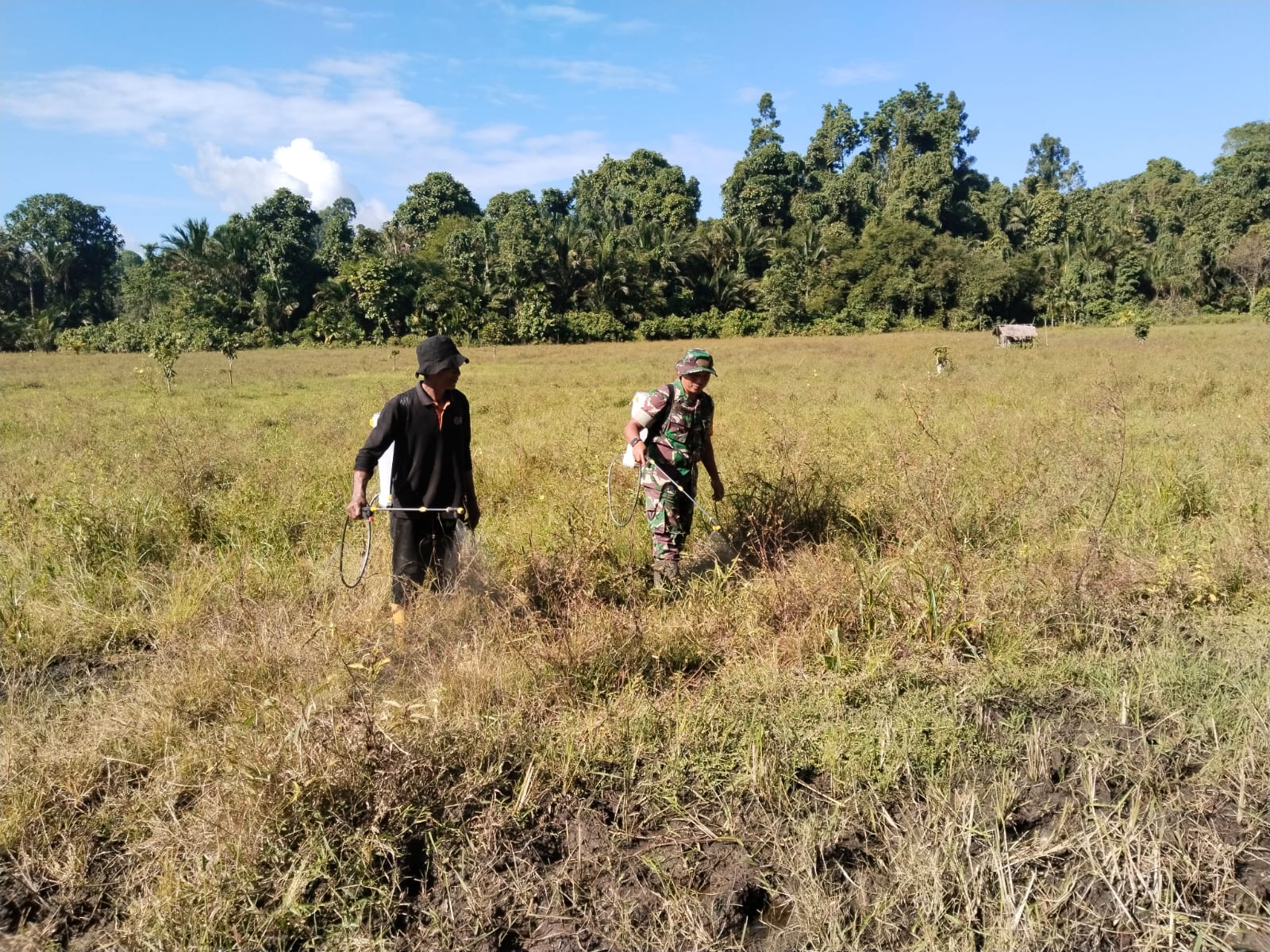 Babinsa Koramil 06/Teluk Dalam, Kodim 0115/Simeulue, Korem 012/Teuku Umar, Koptu Apriandi melaksanakan pendampingan bersama petani melakukan penyemprotan racun rumput masal di Blang solok Desa Gunung Putih, Kecamatan Teluk Dalam, Kabupaten Simeulue. Kamis (24/07/2025).